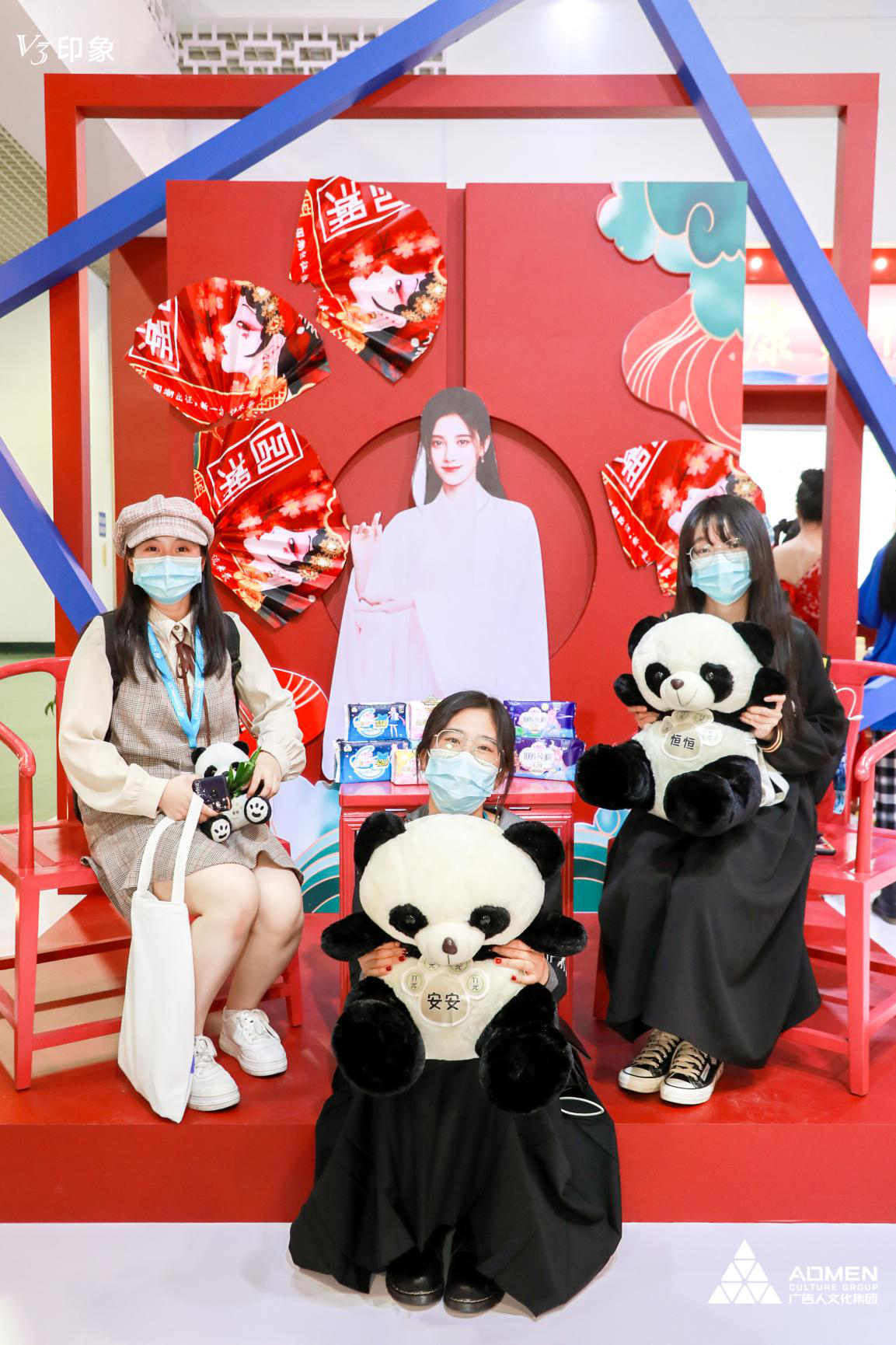 CA88集团展位的正红布景极具特色,吸引了众多国风爱好者前来打卡,不少汉服小仙女都被熊猫玩偶萌翻了,纷纷合影留念。